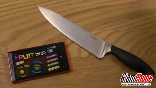 วันนี้มีหนึ่งคลิปวิดีโอที่น่าสนใจมานำเสนอ โดยเป็นการเล่นเกมยอดฮิตอย่าง Fruit Ninja ที่ใช้มีดจริงๆ เล่นบนสมาร์ทโฟนรุ่นใหม่ของโนเกีย รุ่น Lumia 920 ที่มีเทคโนโลยีตรวจจับระบบสัมผัสบนหน้าจอ ที่เรียกว่า "Super Sensitive Touch" ซึ่งจะทำให้ผู้ใช้สามารถสัมผัสหน้าจอได้แม้ขณะใส่ถุงมือ หรือใช้วัสดุอื่นๆ ที่มีความแข็ง เช่น ไขควง, ปากกา หรือกุญแจ ก็ทำได้อย่างง่ายดายและไม่ต้องกังวงว่าหน้าจะเป็นรอย เพราะกระจกหน้าจอผลิตจาก Gorilla Glass ที่มีคุณสนมบัติป้องกันรอยขีดข่วนได้อย่างดีเยี่ยม